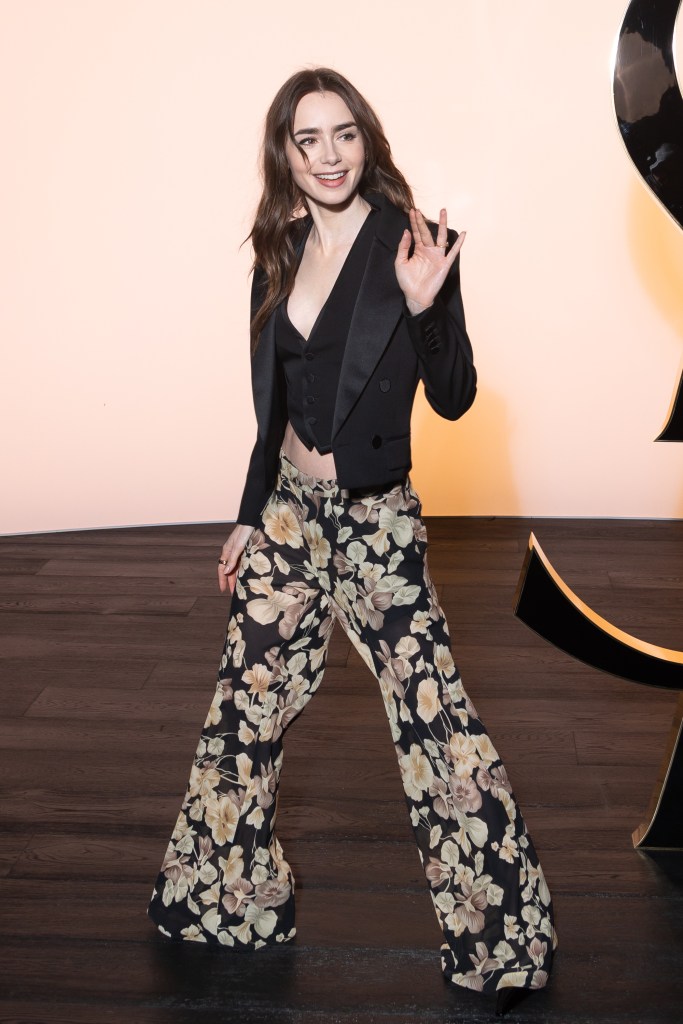 Lily Collins setzt auf einen gekonnten Stilbruch: Während die Blumenhose feminin und verspielt wirkt, kombiniert sie dazu eine maskuline Anzugweste und einen strukturierten Smoking-Blazer. So entsteht ein edler, moderner Look, der sowohl schick als auch lässig ist.