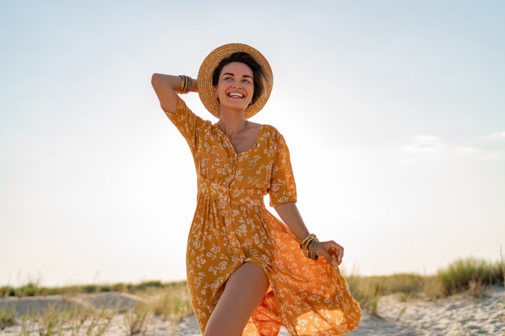Kombiniere dazu: Hochgestecktes Haar, einen Hauch Bronzer und einen eiskalten Aperol Spritz.