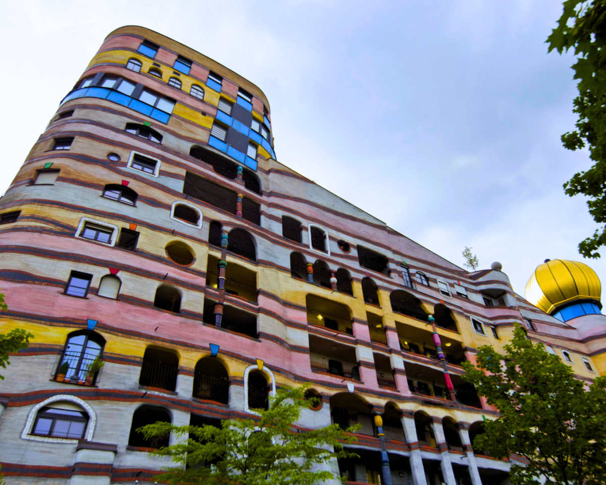 Hundertwasser war für seine Abneigung gegen gerade Linien bekannt, die er einmal als „Werkzeuge des Teufels“ bezeichnete. Die 2000 fertiggestellte Waldspirale ist ein lauter, farbenfroher Beweis dafür. Das Gebäude mit seinen 12 Stockwerken, 105 Wohnungen und über 1.000 Fenstern verzichtet vollständig auf gerade Kanten. Kein Fenster gleicht dem anderen und viele Apartments haben Buchen, Ahorne oder Linden auf dem Dach – und auch das hat einen Grund: